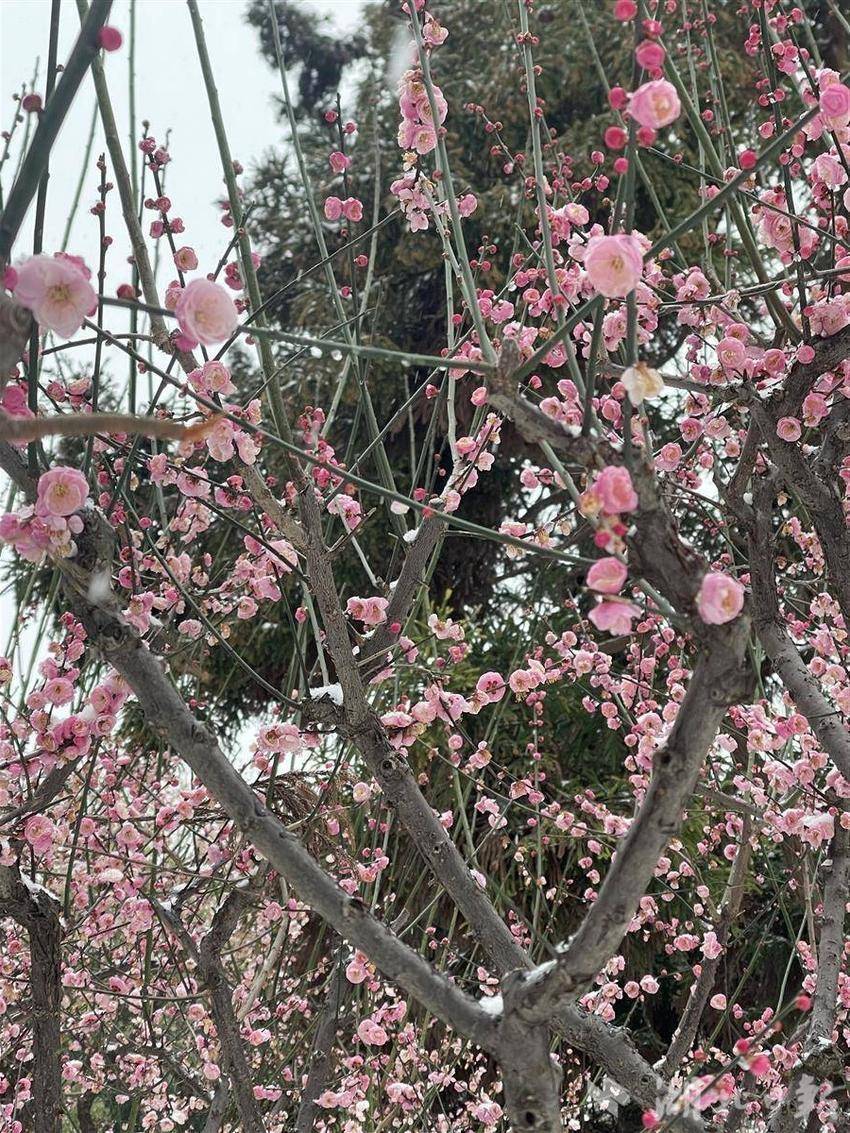 “本年这梅花开得真早,雪一下,好意思得像加了滤镜不异!”在自如公园,举入部属手机拍不休的李姑娘得意地说。她目下的数十株梅树正“雪中怒放”,深红、粉白的花朵从积雪中探出面来,晶莹彻亮。“咔嚓”的快门声雄起雌伏,市民们用镜头纪录这困难的“雪梅相映”画面。
