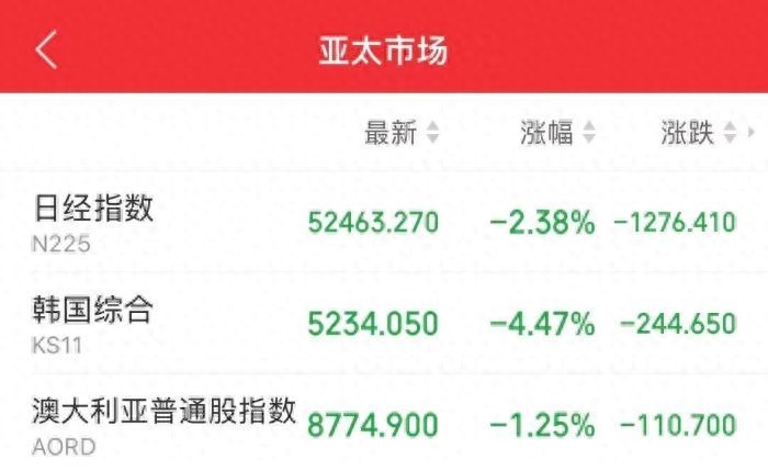 2日,日韩股市盘中速即走低,韩国来往所还运行KOSDAQ指数熔断机制,最终集体大幅收跌,日经225指数跌超2%;韩国概述指数跌超4%。好意思欧股市虽还未开盘,但好意思欧股指期货亦集体下挫。